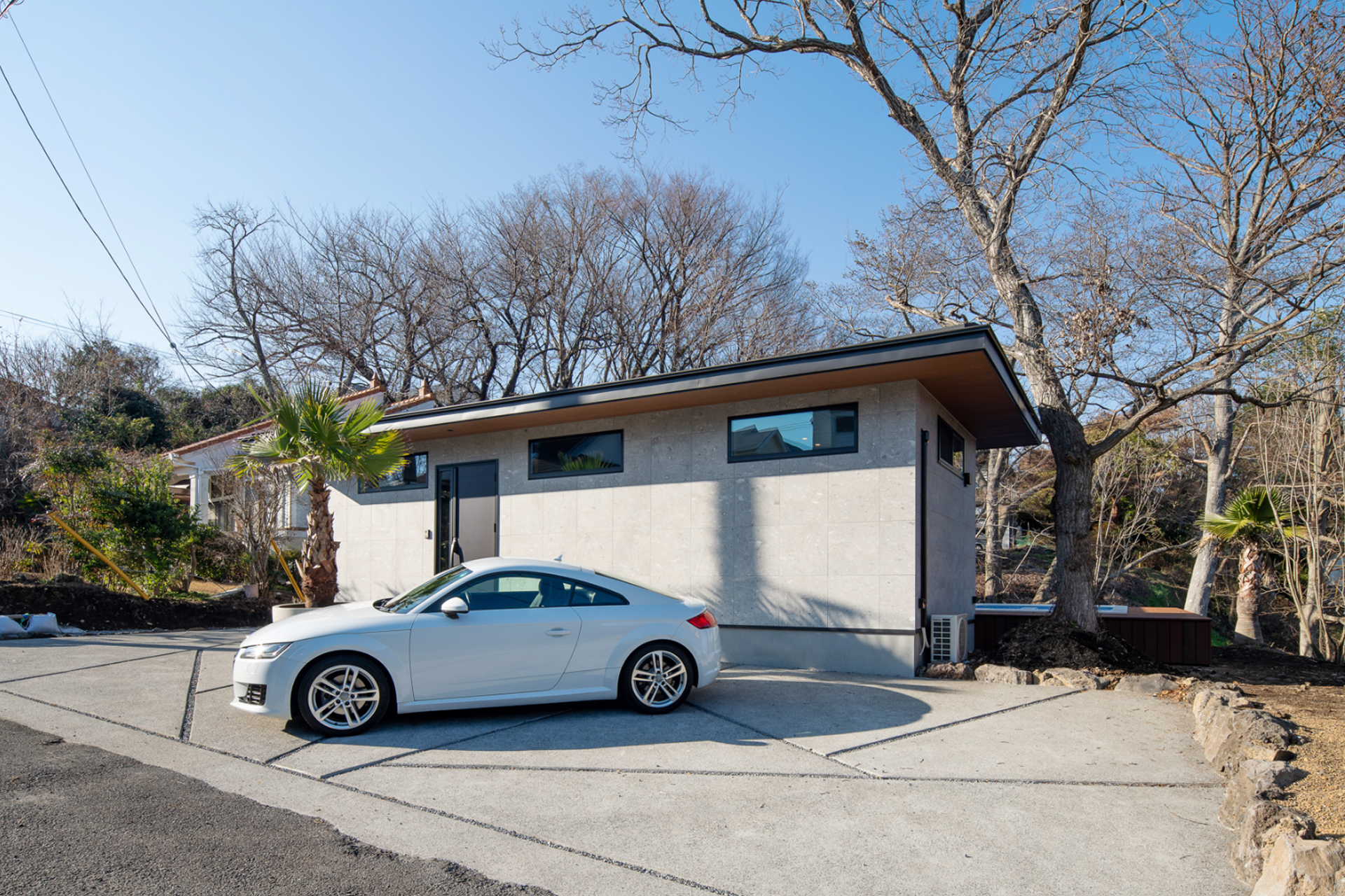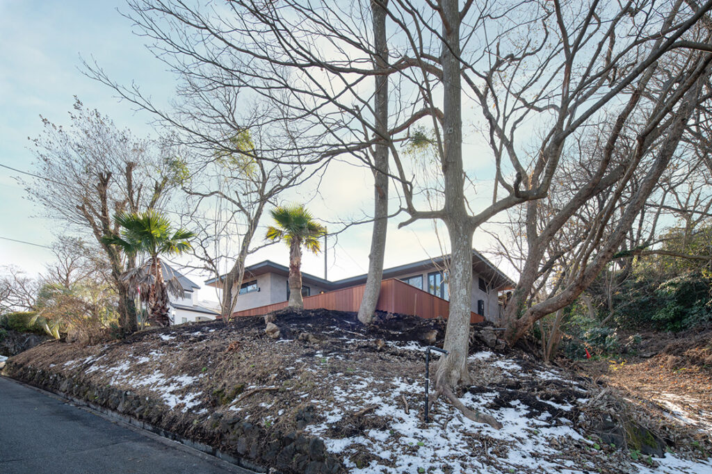 朝、この家は外観から受ける印象そのままに、一日の立ち上がりがどこか軽い。斜面に沿って立つ平屋は、周囲の木々に包まれながらも閉じきってはおらず、窓の向こうに空の明るさがきちんと入ってくる。