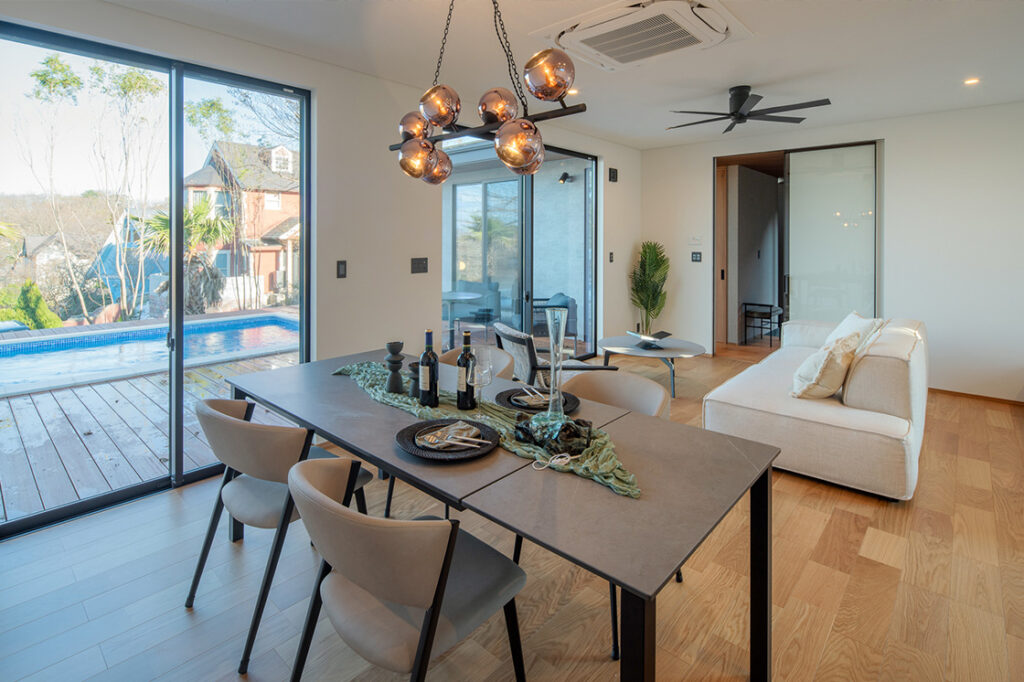 大きな開口の向こうにプライベートプールが広がり、室内にはやわらかな光が差し込み、平屋ならではの素直なつながりが心地よく感じられます。