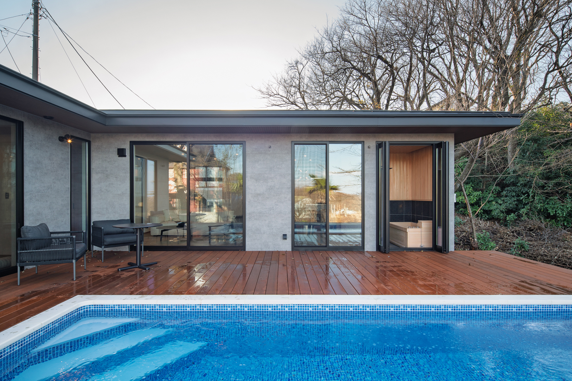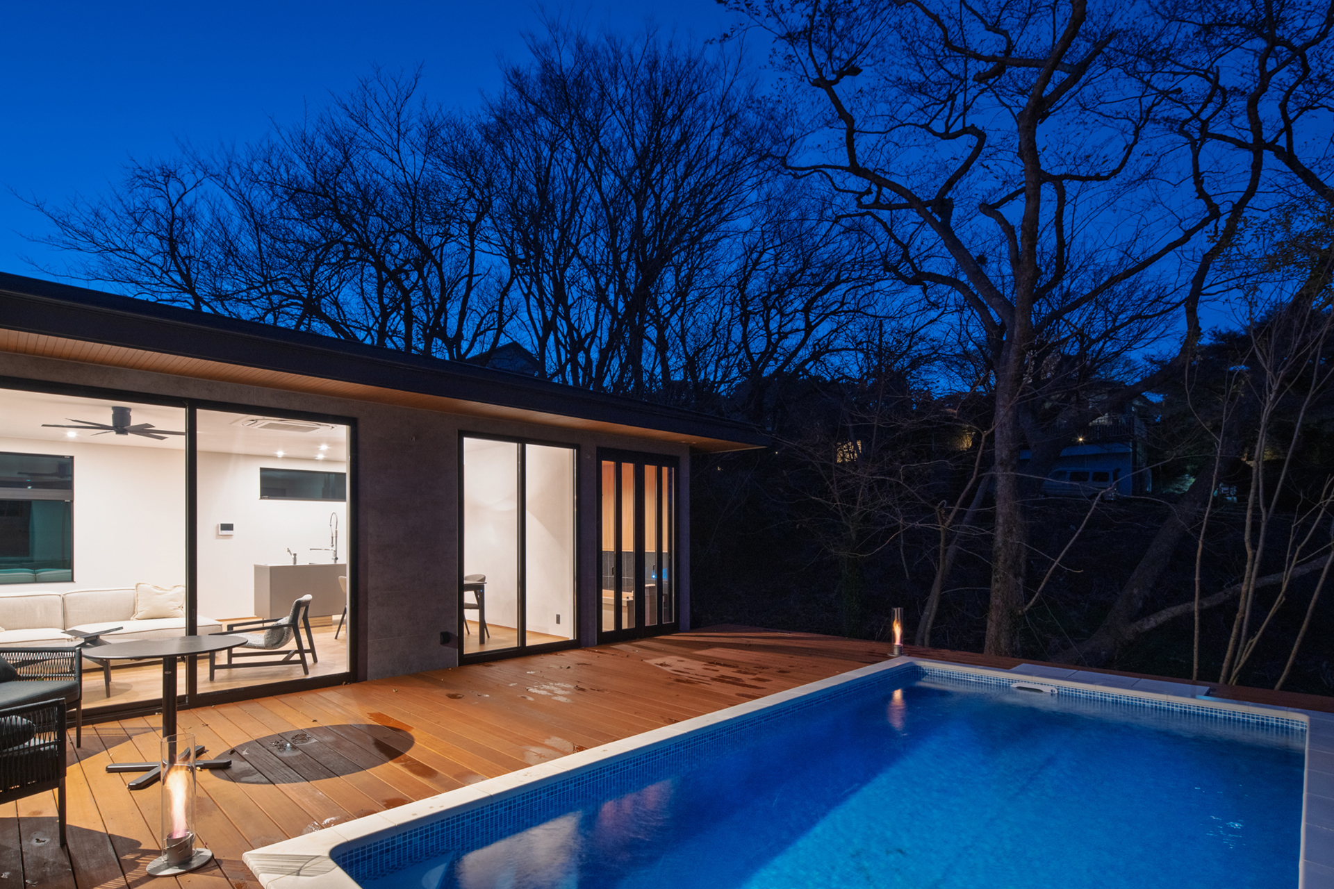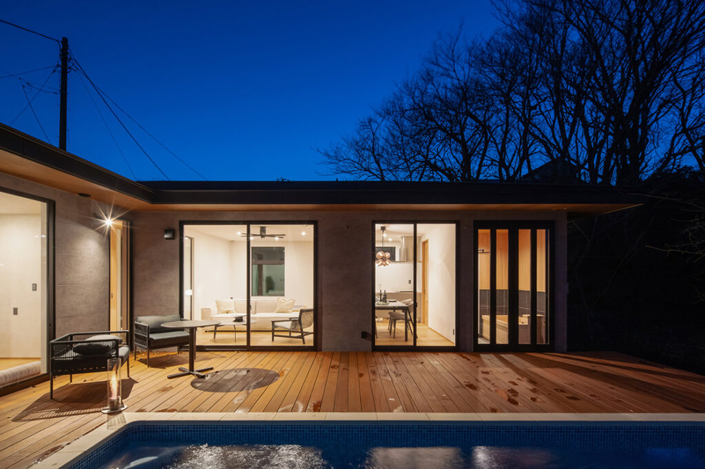 やわらかな灯りが室内からこぼれ、デッキとプールサイドには静かな余韻が広がっていく。