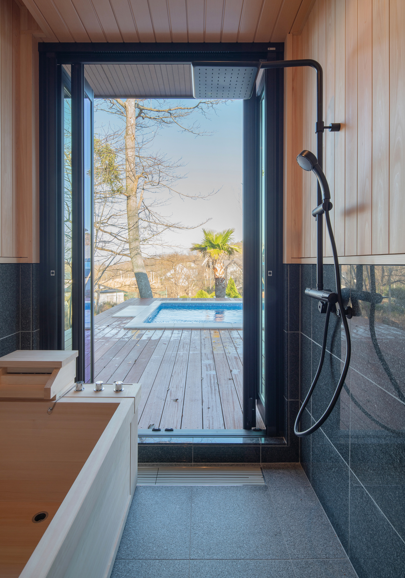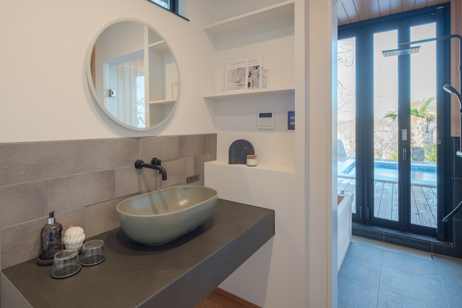 その一方で、この家ならではの贅沢として、天然温泉に身をゆだねる時間があります。外の気配を感じながら、何にも急かされず、静かに身体と心をほどいていく夜。