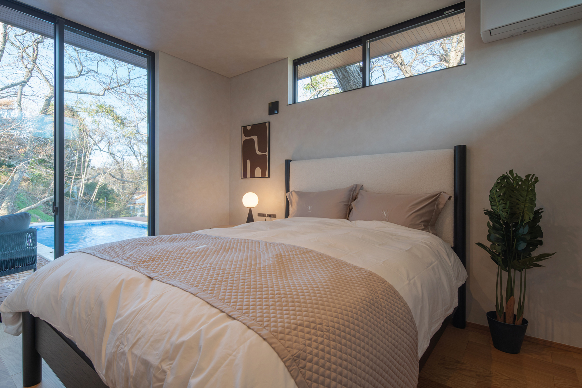 海と自然に近い静かな立地、新築平屋の整った心地よさ、プライベートプールと天然温泉を備えた私的な贅沢、そして2LDK という無理のない器の美しさ。